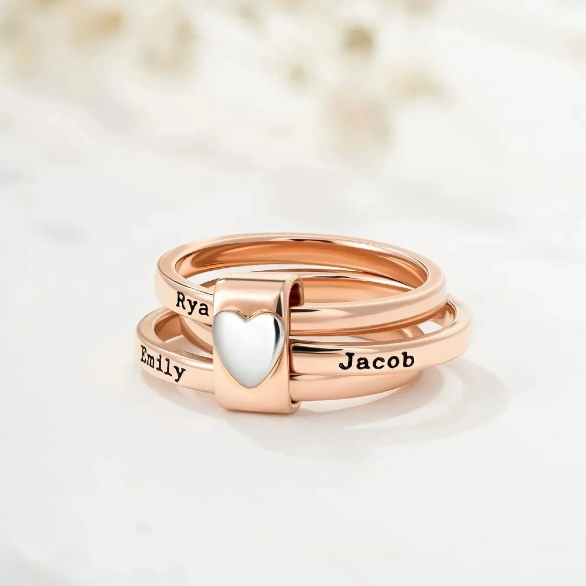 - Design: Personalized name stacking rings with heart