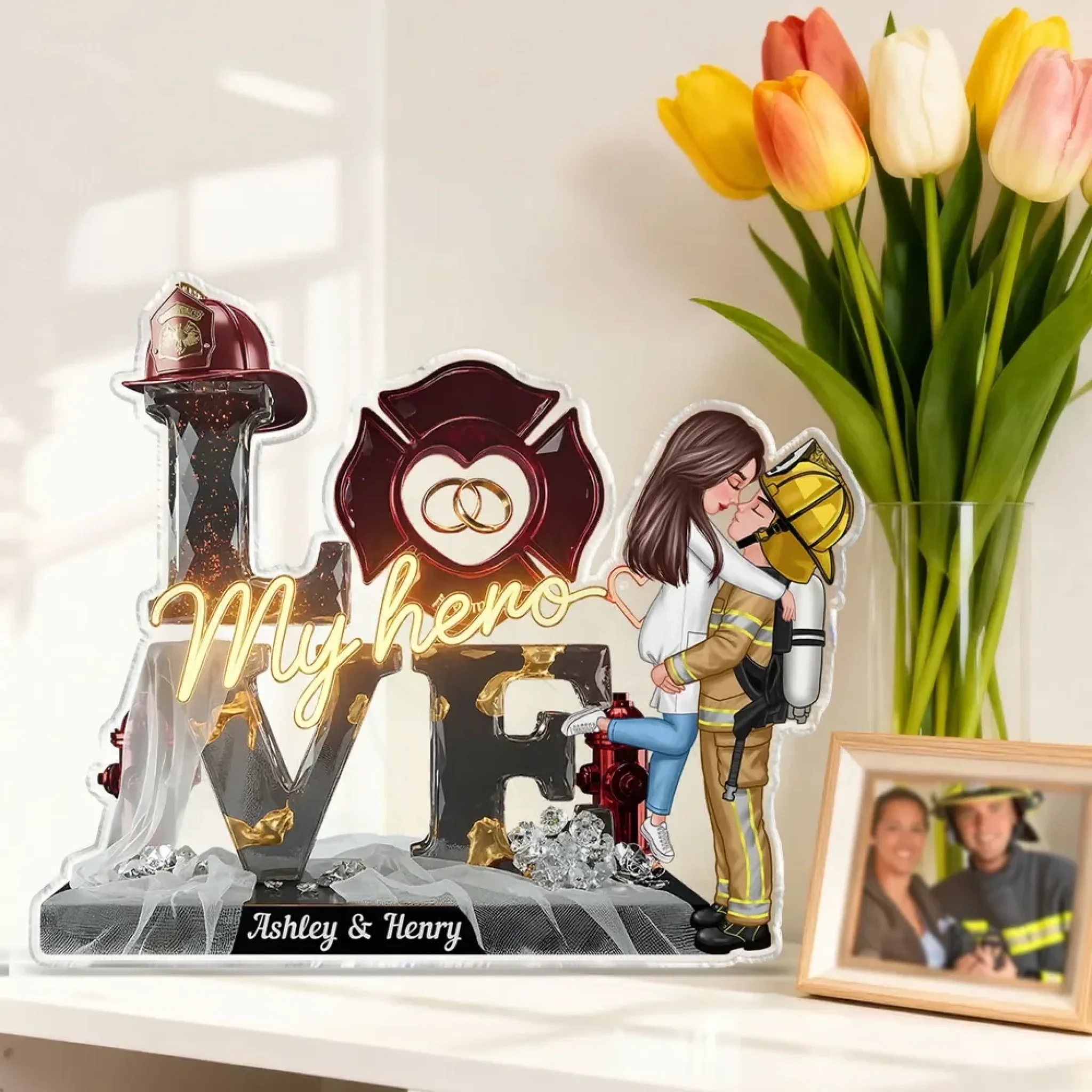 My Hero Firefighter Couple - Personalized Acrylic Block Plaque - Valentine's Day For Him, For Her