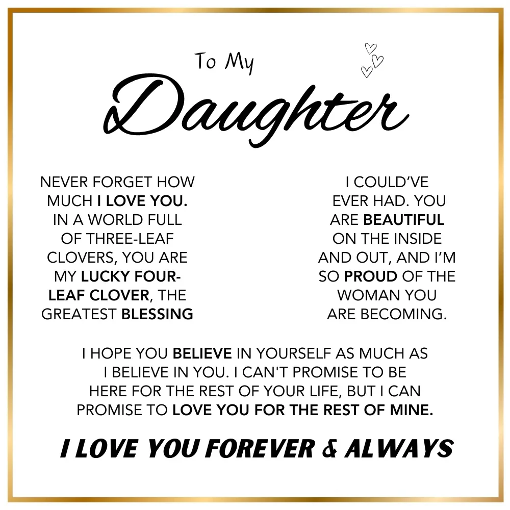 Let your daughter carry a piece of your heart wherever she goes. This thoughtful gift set, featuring a 4-leaf clover charm necklace, an everlasting Forever Rose, and a meaningful message card—is a timeless reminder of your love, support, and blessings.